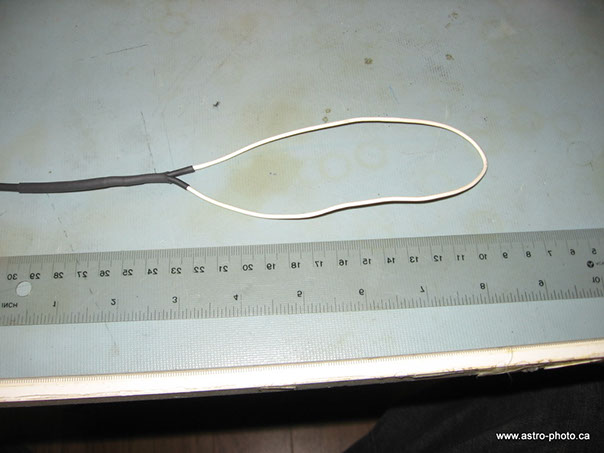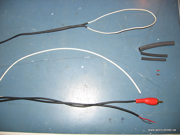 - Sertir un extrémité du fil NiCr au conducteur central du fil RCA (positif), placer et chauffer le tube rétrécissant.