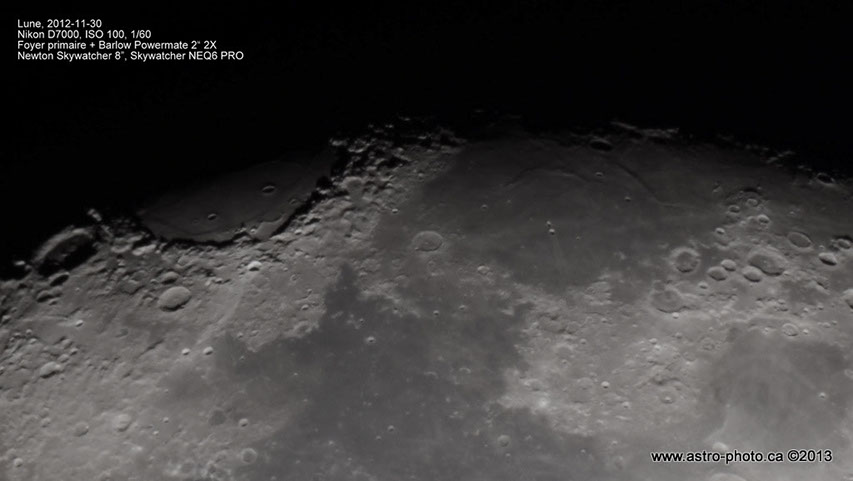 30 novembre 2012, Lune, Nikon D7000, Foyer primaire + Powermate 2 X2, ISO 100, 1/60 s.